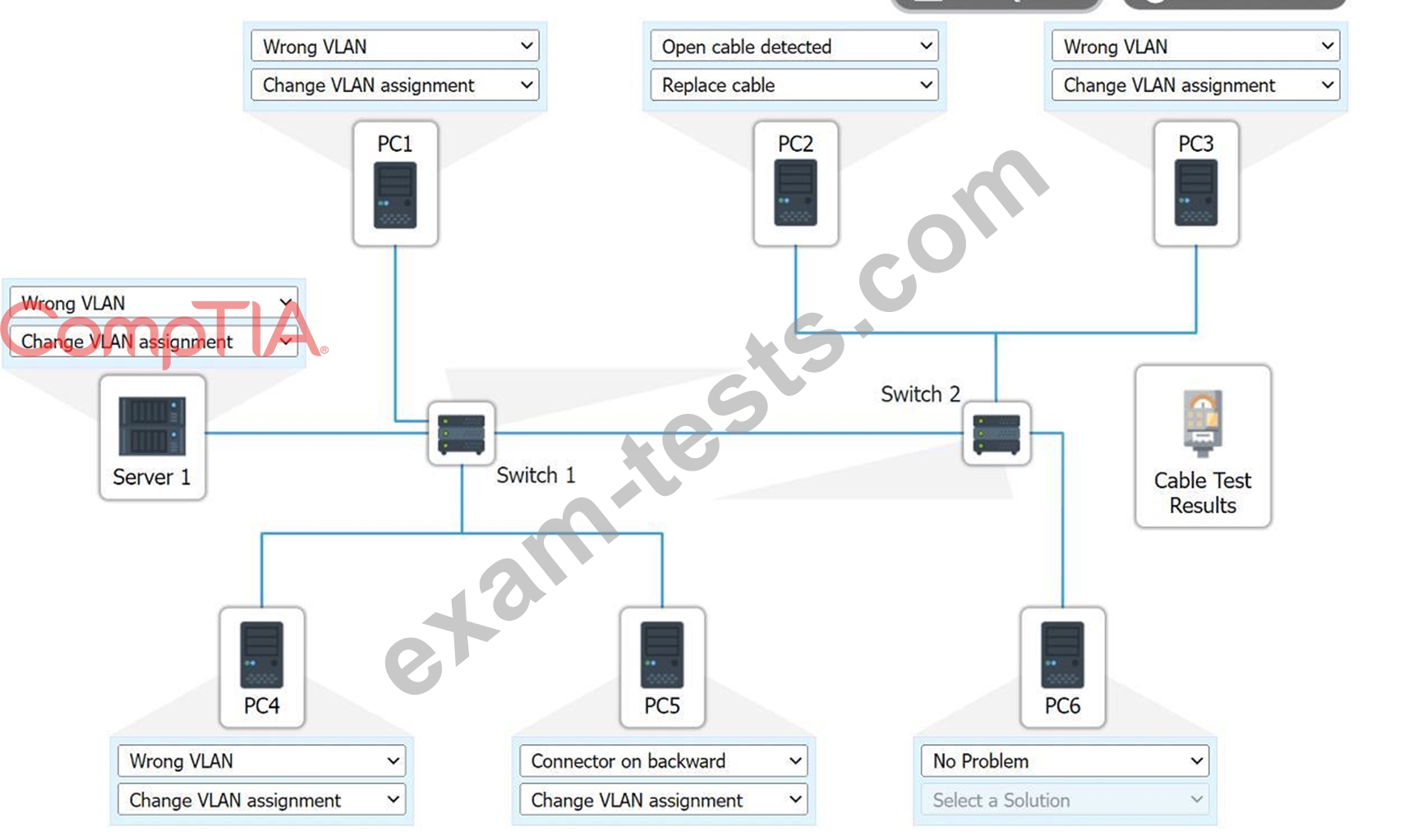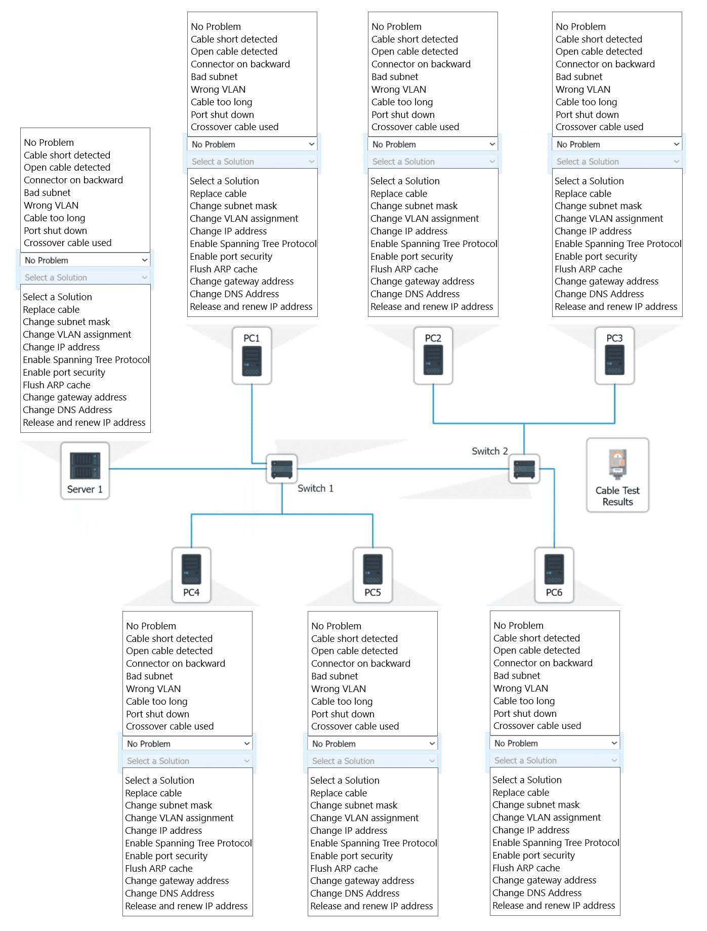 Review the cable test results first, then diagnose by clicking on the appropriate PC, server, and Layer 2 switch.