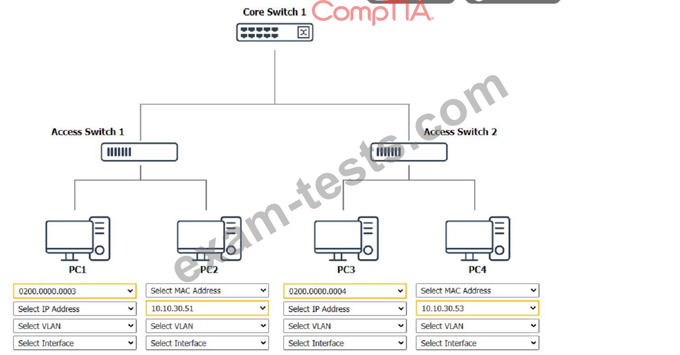 Click on each switch to perform a network discovery by entering commands into the terminal. Fill in the missing information using drop-down menus provided.