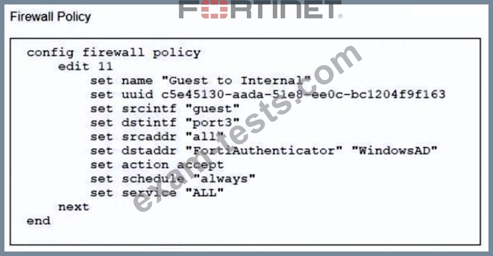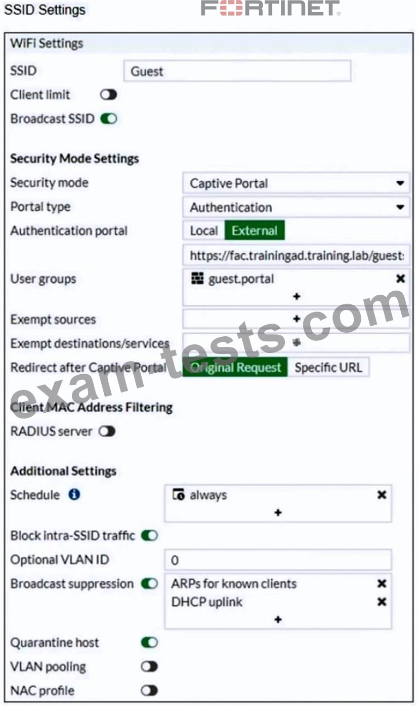 Examine the firewall policy configuration and SSID settings. An administrator has configured a guest wireless network on FortiGate using the external captive portal. The administrator has verified that the external captive portal URL is correct. However wireless users are not able to see the captive portal login page. Given the configuration shown in the exhibit and the SSID settings, which configuration change should the administrator make to fix the problem?