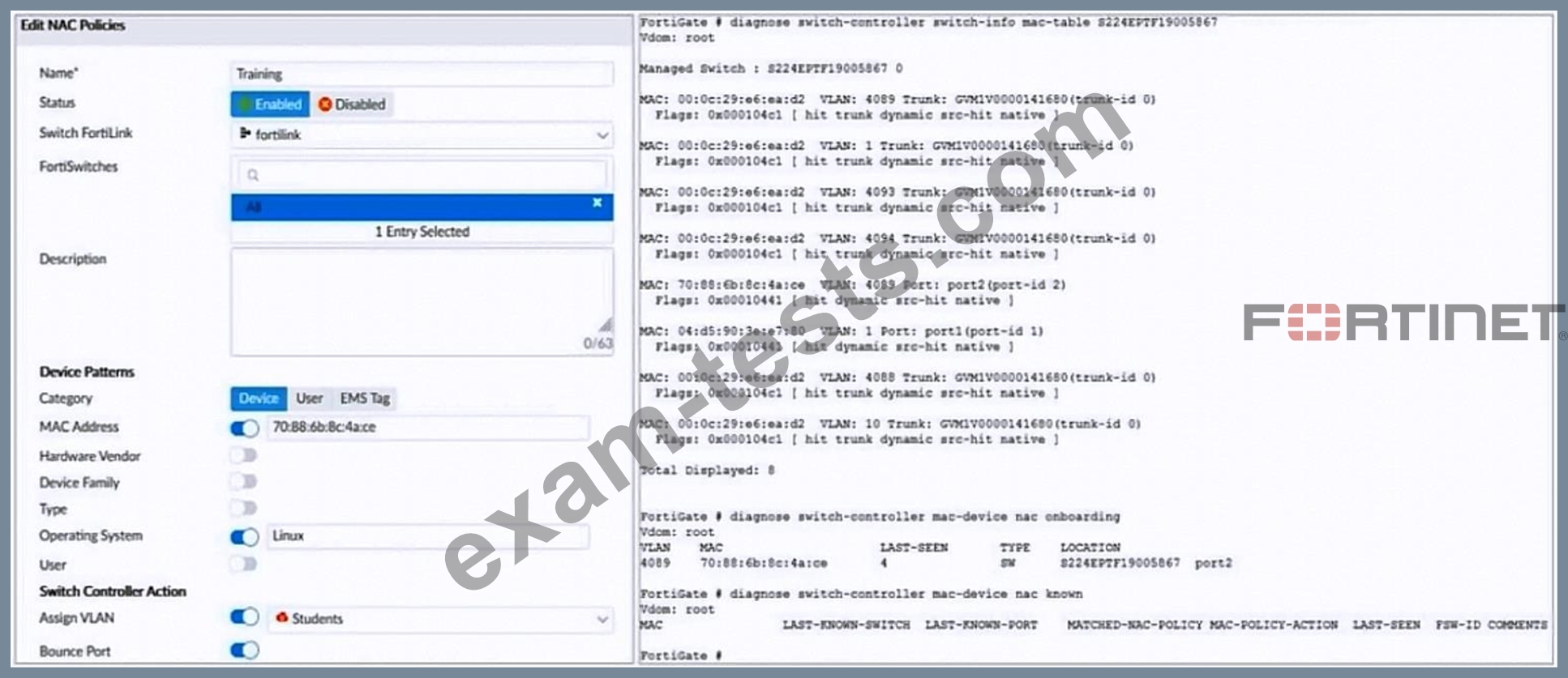 An administrator is testing the NAC feature. The test device is connected to a managed FortiSwitch device (S224EPTF19005867) on port2.