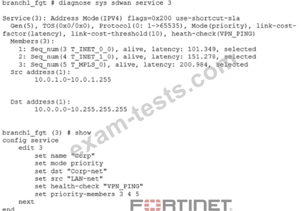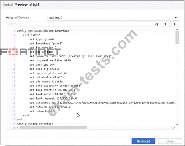SD-WAN topology. The exhibit shows the installation preview for one FortiGate device. In the exhibit, which