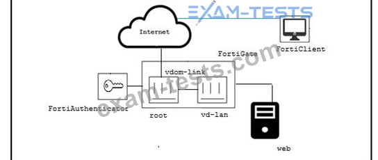 The exhibit shows a topology where a FortiGate is two VDOMS, root and vd-vlasn. The root VDCM provides SSL-VPN access, where the users authenticated by a FortiAuthenticatator. The vd-lan VDOM provids internal access to a Web server. For the remote users to access the internal web server, there are a few requirements, which are shown below.
