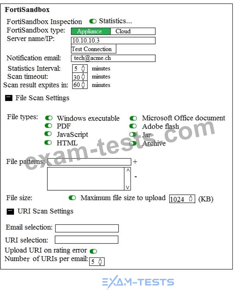 You have installed a FortiSandbox and configured it in your FortiMail. Referring to the exhibit, which two statements are correct? (Choose two.)
