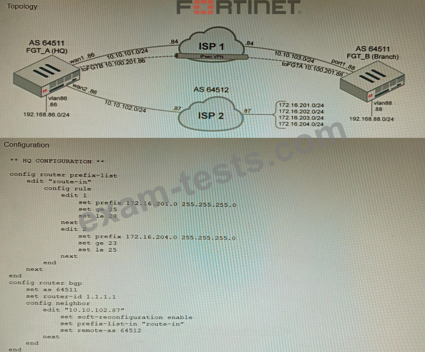 A customer has deployed a FortiGate with iBGP and eBGP routing enabled. HQ is receiving routes over eBGP from ISP 2; however, only certain routes are showing up in the routing table-Assume that BGP is working perfectly and that the only possible modifications to the routing table are solely due to the prefix list that is applied on HQ.