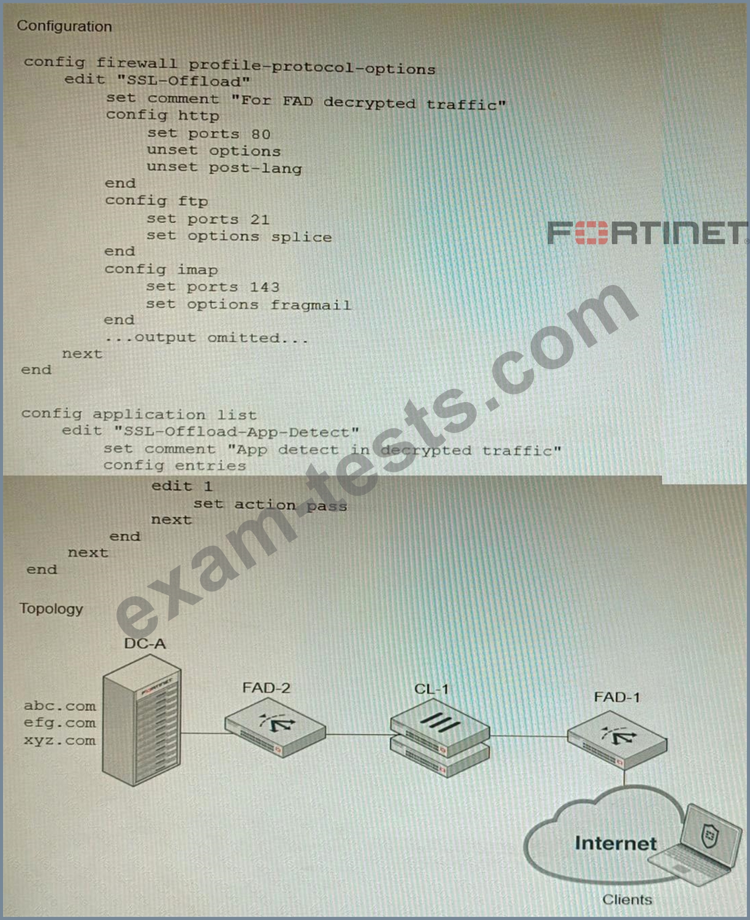 A FortiGate cluster (CL-1) protects a data center hosting multiple web applications. A pair of FortiADC devices are already configured for SSL decryption (FAD-1), and re-encryption (FAD-2). CL-1 must accept unencrypted traffic from FAD-1, perform application detection on the plain-text traffic, and forward the inspected traffic to FAD-2.