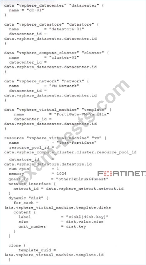 A customer wants to automate the creation and configuration of FortiGate VM instances in a VMware vCenter environment using Terraform. They have the creation part working with the code shown in the exhibit.