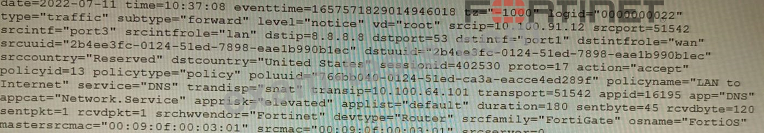 You must analyze an event that happened at 20:37 UTC. One log relevant to the event is extracted from FortiGate logs: