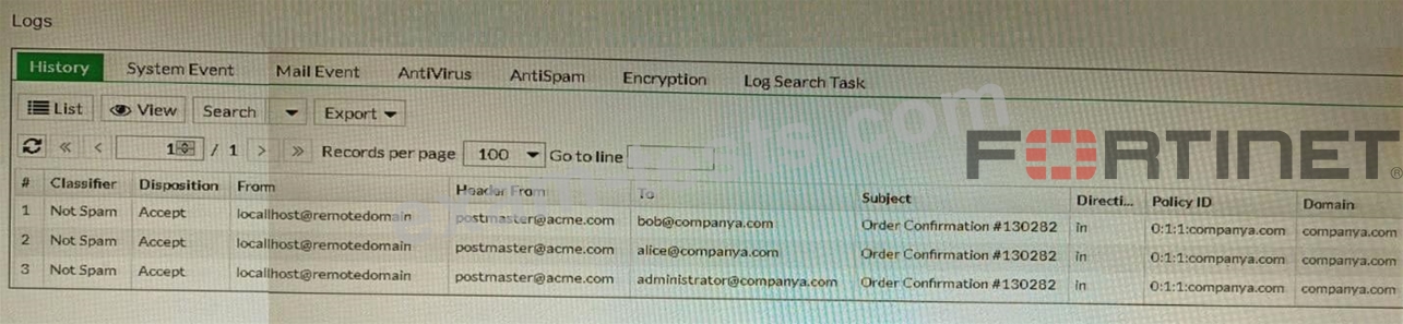 Refer to the exhibit showing the history logs from a FortiMail device.