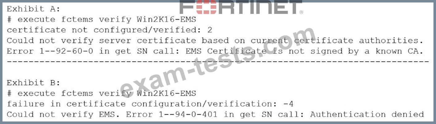 The exhibit shows two error messages from a FortiGate root Security Fabric device when you try to configure a new connection to a FortiClient EMS Server.