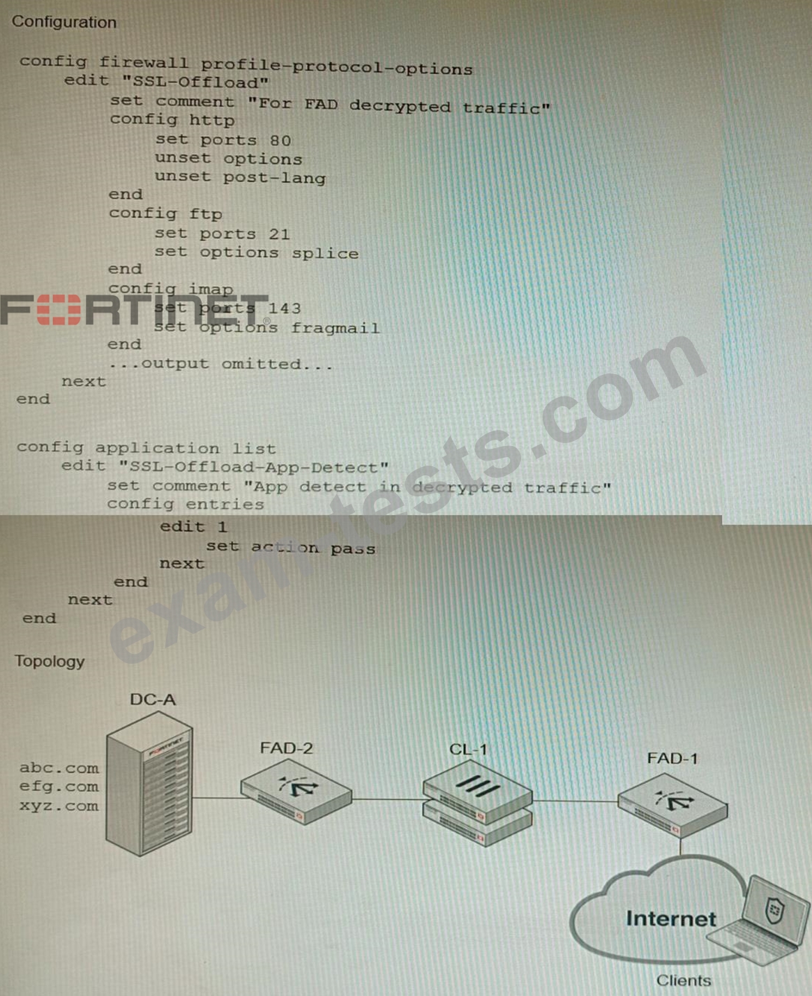 A FortiGate cluster (CL-1) protects a data center hosting multiple web applications. A pair of FortiADC devices are already configured for SSL decryption (FAD-1), and re-encryption (FAD-2). CL-1 must accept unencrypted traffic from FAD-1, perform application detection on the plain-text traffic, and forward the inspected traffic to FAD-2.