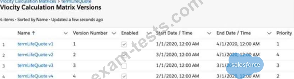 Which Calculation Matrix Version in the list would execute on2/15/2020 at 12:00 PM?