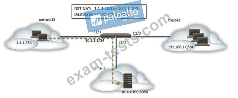 The web server is configured to listen for HTTP traffic on port 8080. The clients access the web server using the IP address 1.1.1.100 on TCP Port 80. The destination NAT rule is configured to translate both IP address and report to 10.1.1.100 on TCP Port 8080.