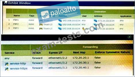 A firewall has three PBF rules and a default route with a next hop of 172.20.10.1 that is configured in the default VR. A user named Will has a PC with a 192.168.10.10 IP address. He makes an HTTPS connection to 172.16.10.20.