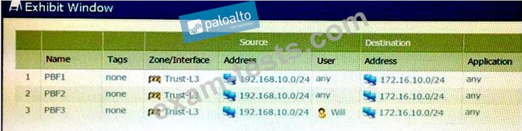 A firewall has three PBF rules and a default route with a next hop of 172.20.10.1 that is configured in the default VR. A user named Will has a PC with a 192.168.10.10 IP address. He makes an HTTPS connection to