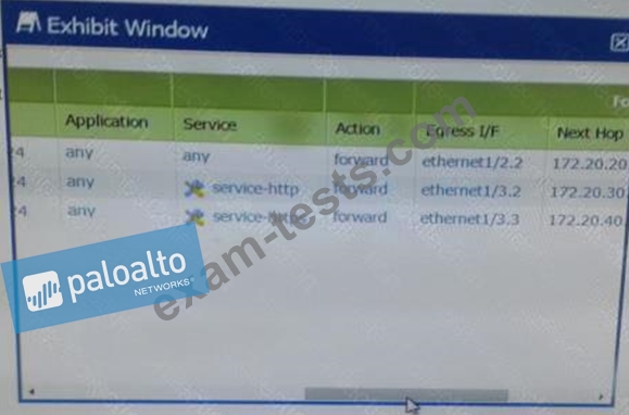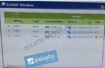 A firewall has three PDF rules and a default route with a next hop of 172.29.19.1 that is configured in the default VR. A user named XX-bes a PC with a 192.168.101.10 IP address.