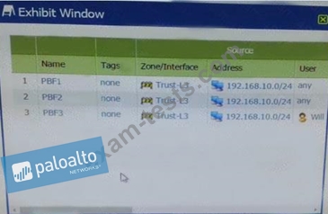 A firewall has three PDF rules and a default route with a next hop of 172.29.19.1 that is configured in the default VR. A user named XX-bes a PC with a 192.168.101.10 IP address.