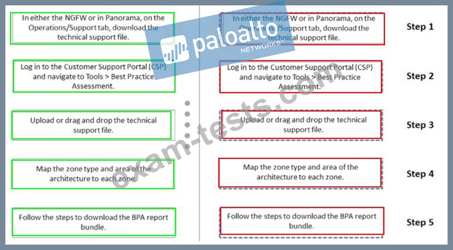 Below are the steps in the workflow for creating a Best Practice Assessment in a firewall and Panorama configuration Place the steps in order.