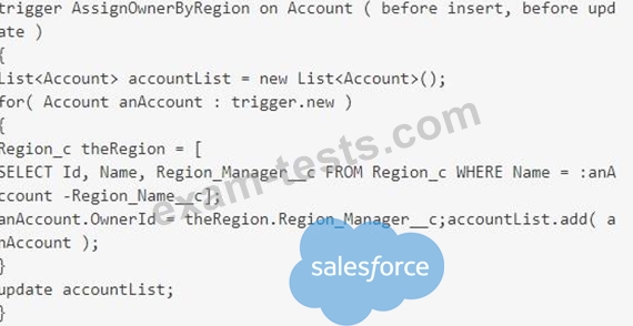 Consider the above trigger intended to assign the Account to the manager of the Account''s region. Which two changes should a developer make in this trigger to adhere to best practices? Choose 2 answers