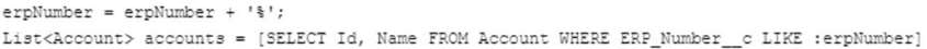 Universal Containers uses a custom Lightning page to provide a mechanism to perform a step-by-step wizard search for Accounts. One of the steps in the wizard is to allow the user to input text into a text field, ERP_Number__c, that is then used in a query to find matching Accounts.