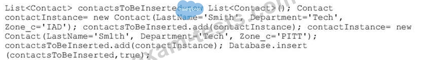 The Contact object has a custom field called "Zone." Its data type is "Text" and field length is 3. What is the outcome after executing the following code snippet in the org?