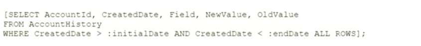 Given the code below, which select statement should be inserted below as a valid way to retrieve the Account History records ranging from 12 to 24 month old?