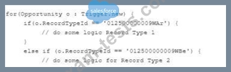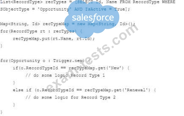 A company wants to run different logic based on an Opportunity's record type. Which code segment handles this request and follows best practices?