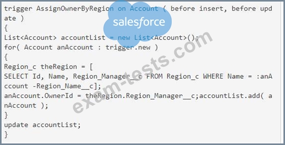 Consider the above trigger intended to assign the Account to the manager of the Account''s region. Which two changes should a developer make in this trigger to adhere to best practices? Choose 2 answers