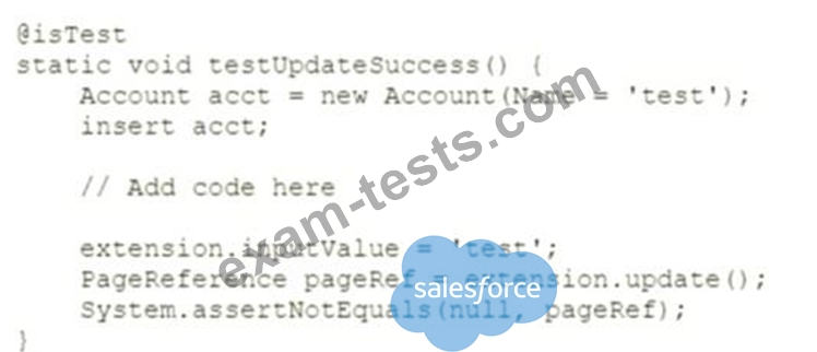 What should be added to the setup, in the location indicated, for the unit test above to create the controller extension for the test?