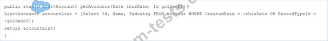 The Apex method is executed in an environment with a large data volume count for Accounts, and the query Is performing poorly.