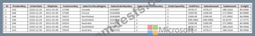 You are creating a sales report in Power Bl for the NorthWest region sales territory of your company. Data will come from a view in a Microsoft SQL Server database. A sample of the data is shown in the following table: