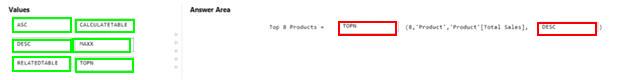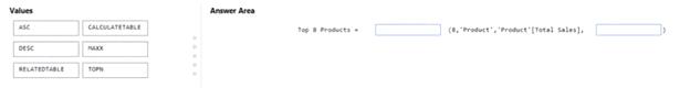 How should you complete the DAX expression? To answer, drag the appropriate values to the coned targets. Each value may be used once, more than once, or not at all. You may need to drag the split bar between panes or scroll to view content.