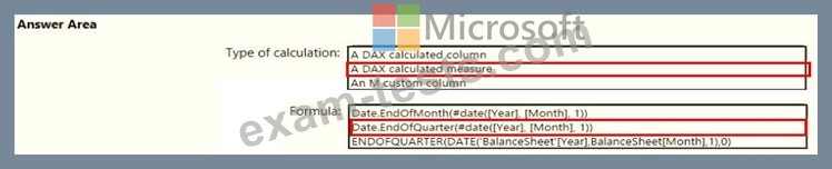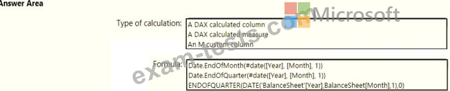You need to calculate the last day of the month in the balance sheet data to ensure that you can relate the balance sheet data to the Date table. Which type of calculation and which formula should you use? To answer, select the appropriate options in the answer are a. NOTE: Each correct selection is worth one point.
