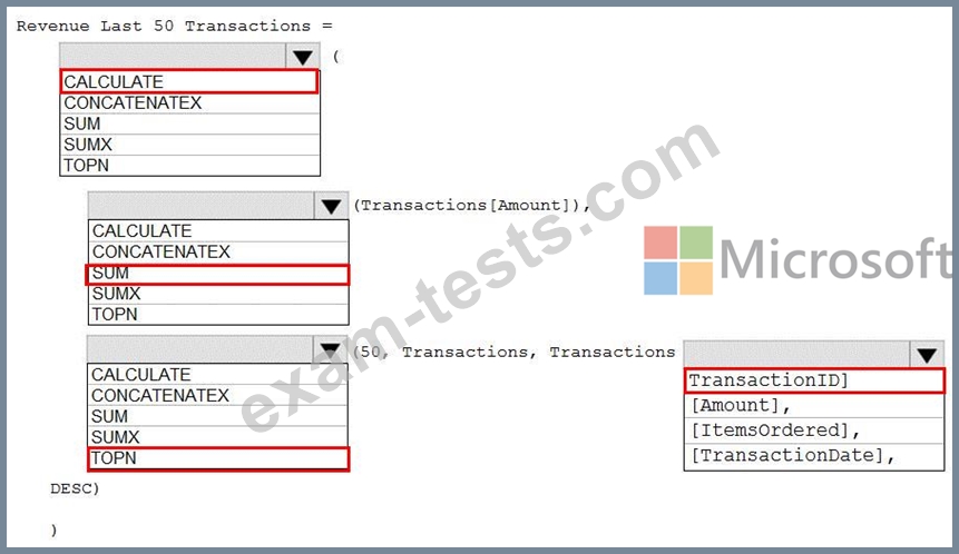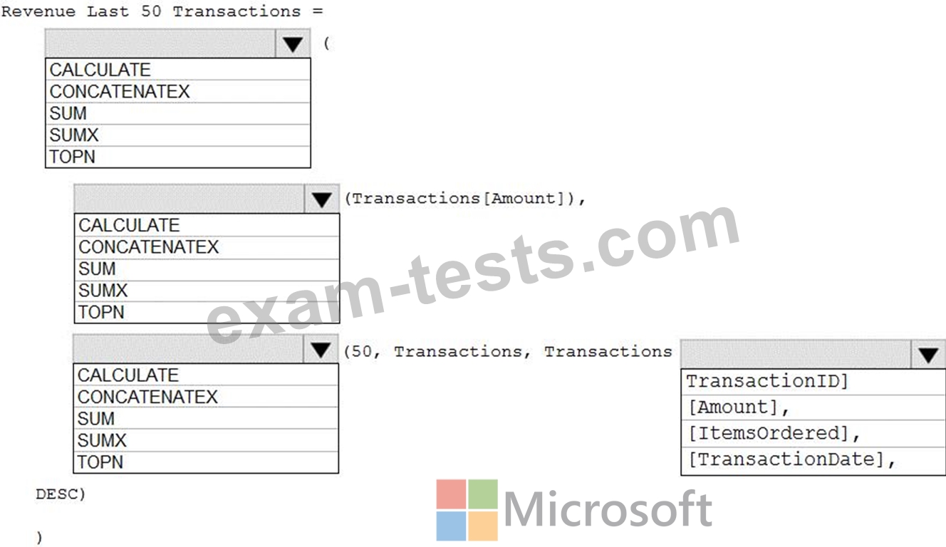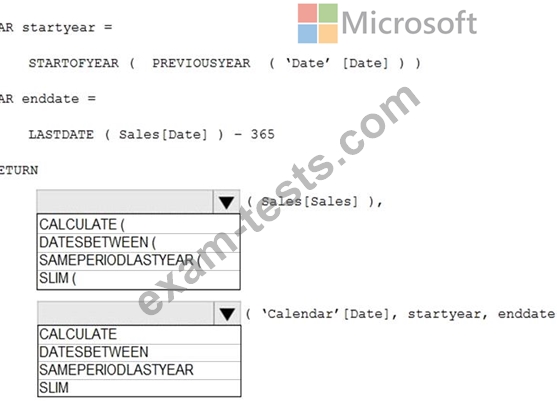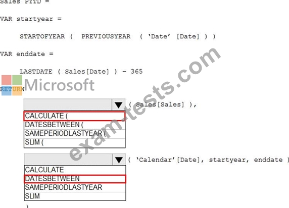 How should you complete the DAX expression? To answer, select the appropriate options in the answer area.