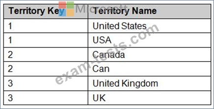You add another table named Territory to the model. A sample of the data is shown in the following table.
