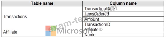 The managers request a visual showing the total sales value of the latest 50 transactions for each affiliate. You have a data model that contains the following tables.