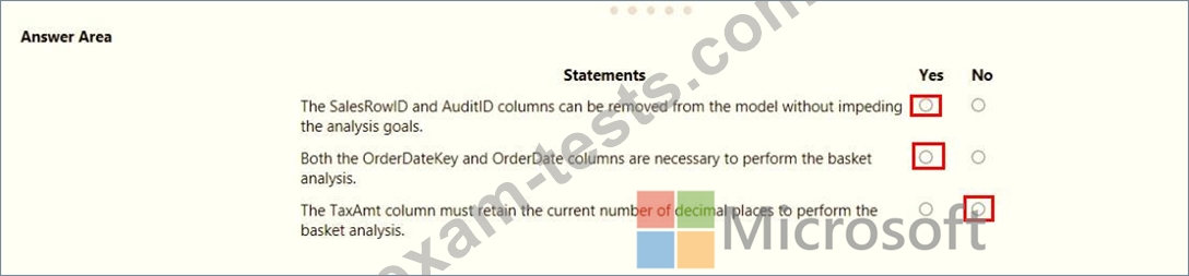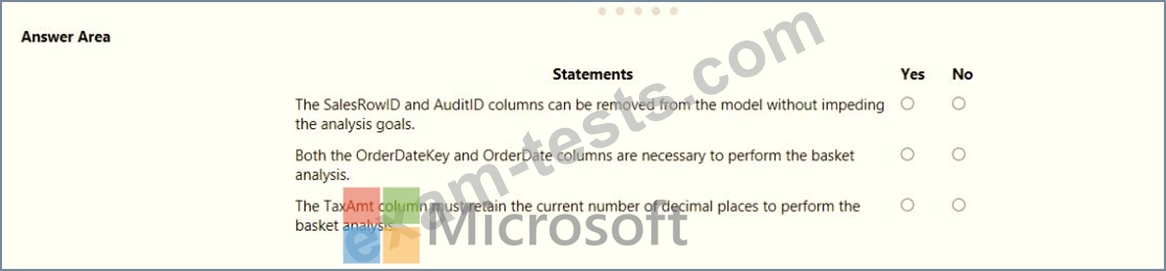 You are creating a Microsoft Power Bl imported data model to perform basket analysis. The goal of the analysis is to identify which products are usually bought together in the same transaction across and within sales territories.