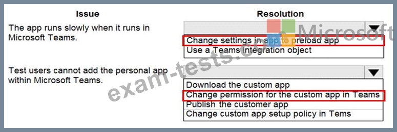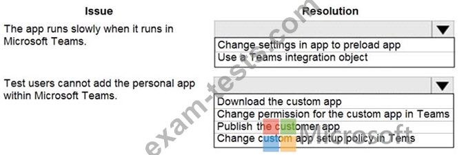 You create a canvas app that will be used by employees at your company. You plan to allow users to embed the app in Microsoft Teams. During testing, the following issues are reported: