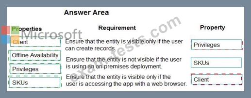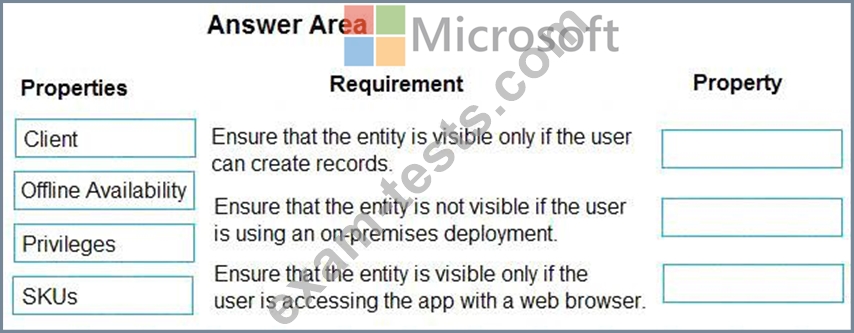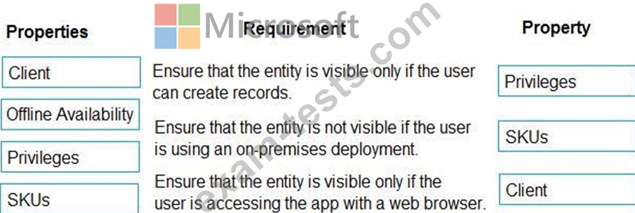 Which properties should you use? To answer, drag the appropriate properties to the correct requirements. Each property may be used once, more than once, or not at all. You may need to drag the split bar between panes or scroll to view content.