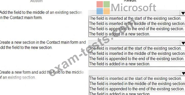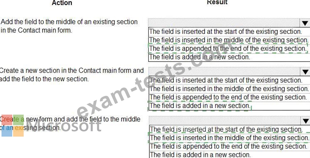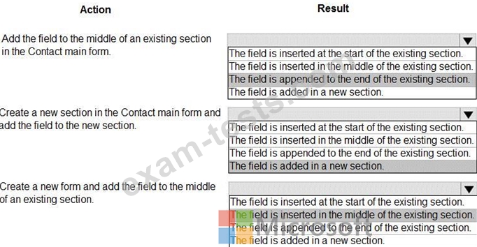 You create a new solution in the development environment. You add the Contact entity and the Contact main form to the solution. You create a custom field on the Contact entity.