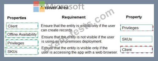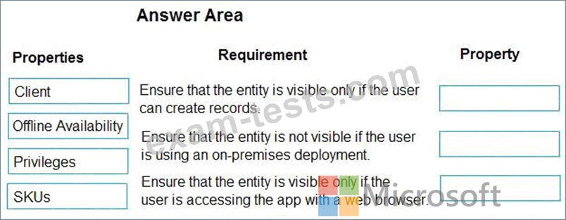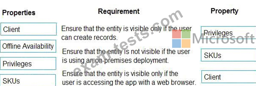 Which properties should you use? To answer, drag the appropriate properties to the correct requirements. Each property may be used once, more than once, or not at all. You may need to drag the split bar between panes or scroll to view content.