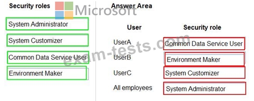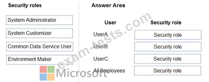 Which security roles should you use? To answer, drag the appropriate security roles to the correct users. Each security role may be used once, more than once, or not at all. You may need to drag the split bar between panes or scroll to view content.