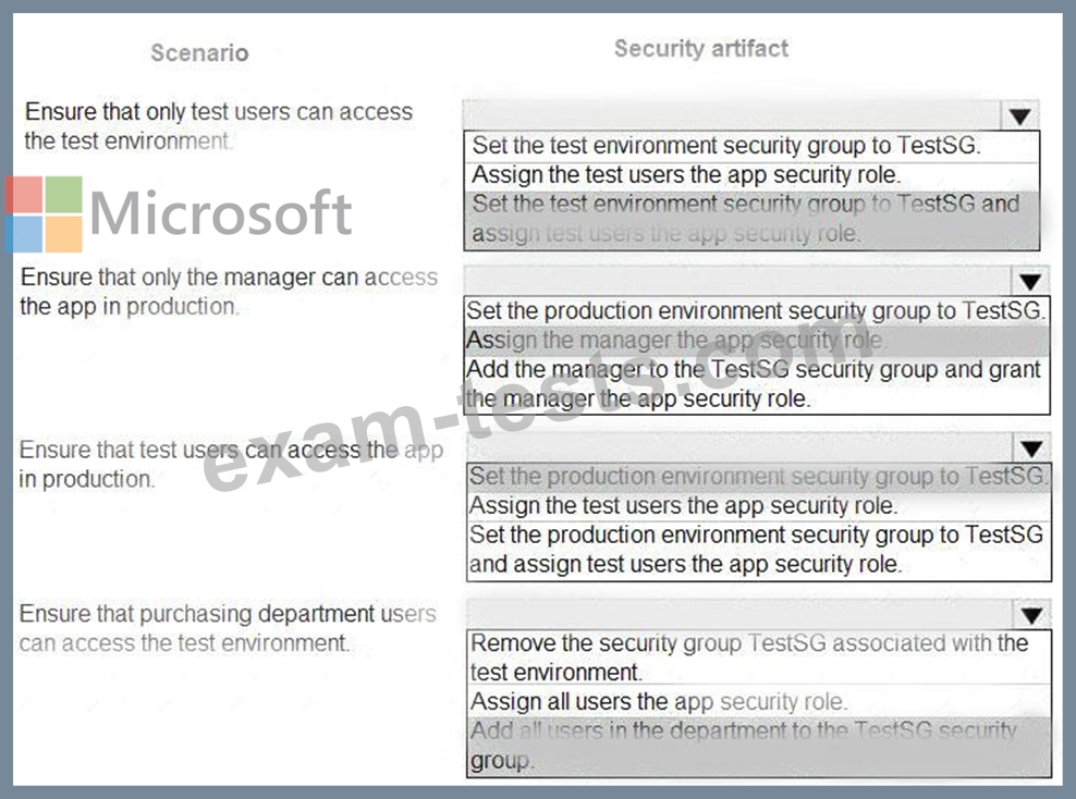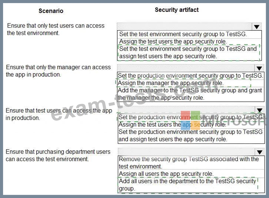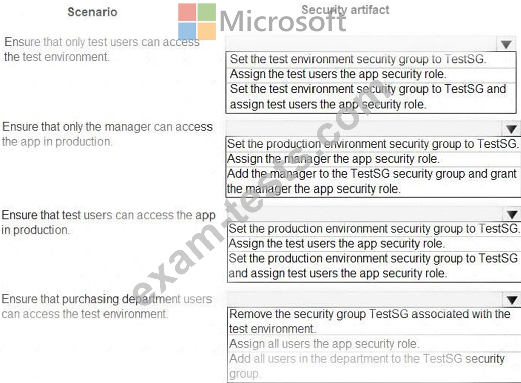 You are developing a model-driven app for the purchasing department of an organization. You provision a new test environment and a security role. You select users to test the apps and assign the users to a security group named TestSG.
