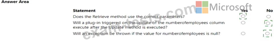 The following code updates the customer size code choice column on the Account table if the number of employees column value is greater than 100. Line numbering is provided for information only.