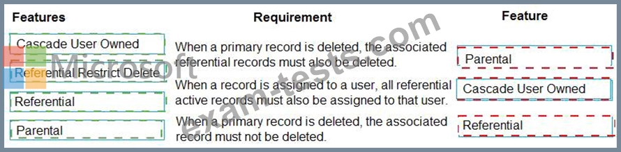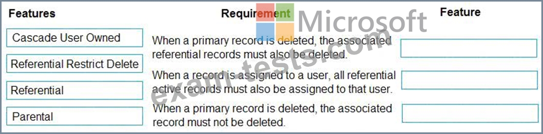 Which features should you select? To answer, drag the appropriate features to the correct requirements. Each feature may be used once, more than once, or not at all. You may needs to drag the split bar between panes or scroll to view content.
