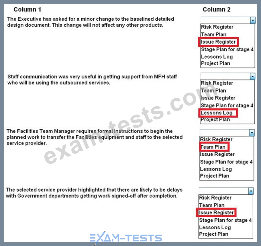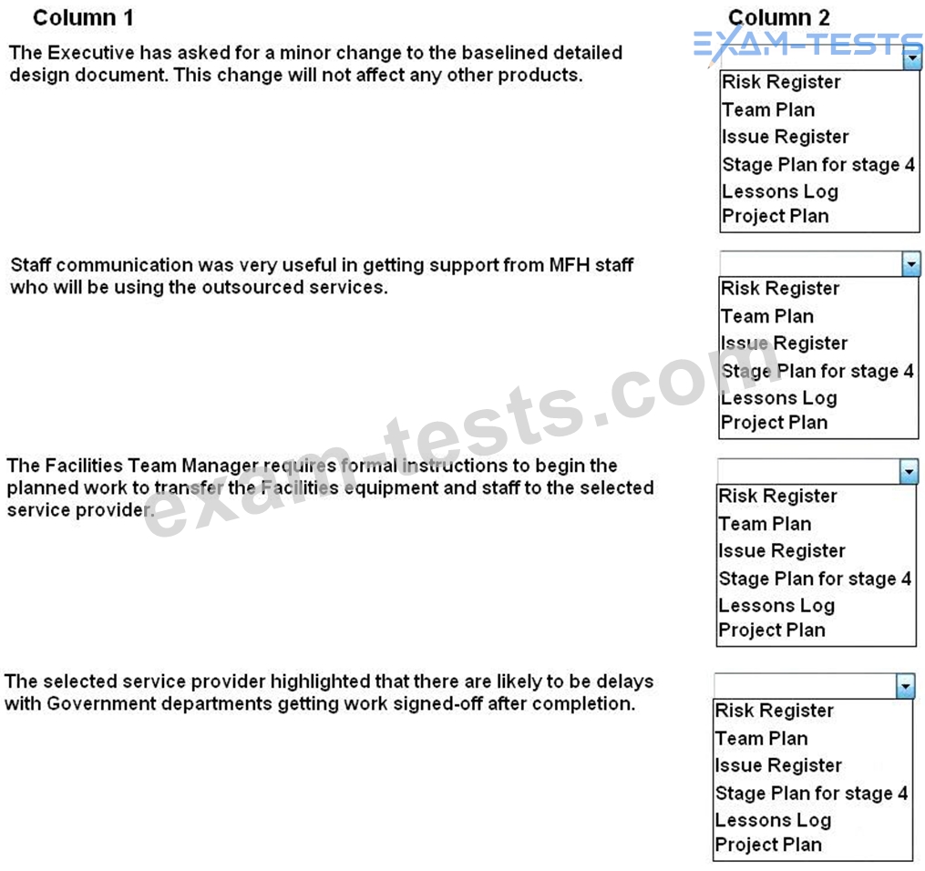 Using the Project Scenario, select the appropriate response to each of the following 5 questions which have been raised by the Project Board.