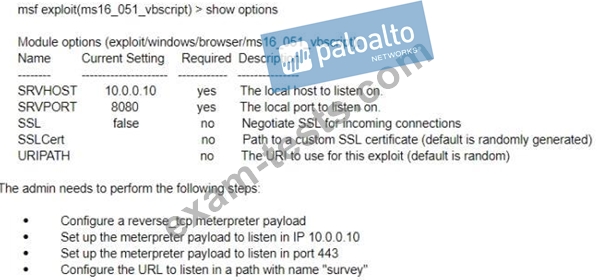 A test for a Microsoft exploit has been planned. After some research Internet Explorer 11 CVE-2016-0189 has been selected and a module in Metasploit has been identified (exploit/windows/browser/ms16_051_vbscript) The description and current configuration of the exploit are as follows;