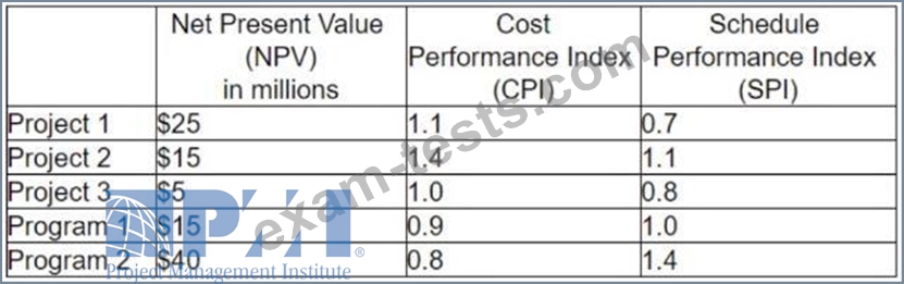 The CEO has requested that the portfolio manager calculate the health of the portfolio to achieve the benefits to the organization. The organization has placed more importance on the CPI metric than the SPI metric, weighting cost at 80% and schedule at 20%. The organization considers the portfolio health to be acceptable if benefits are within a +/- 2% tolerance level.
