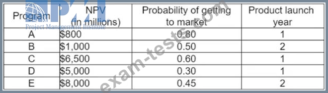 The portfolio manager has updated the financial matrix table for 5 programs. The updated net present value (NPV) and probability of success are listed in the following table: