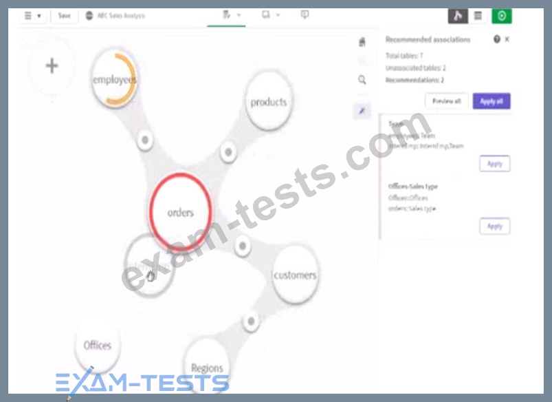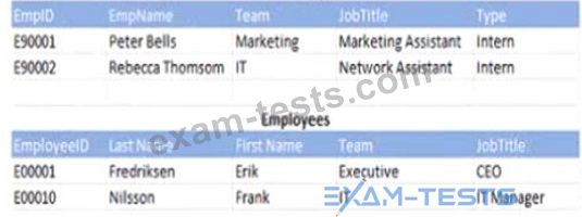 A business analyst must add a list of interns to the current sates app. The app contains an existing employees table When the business analyst profiles the data the association vow displays possible associations as shown.