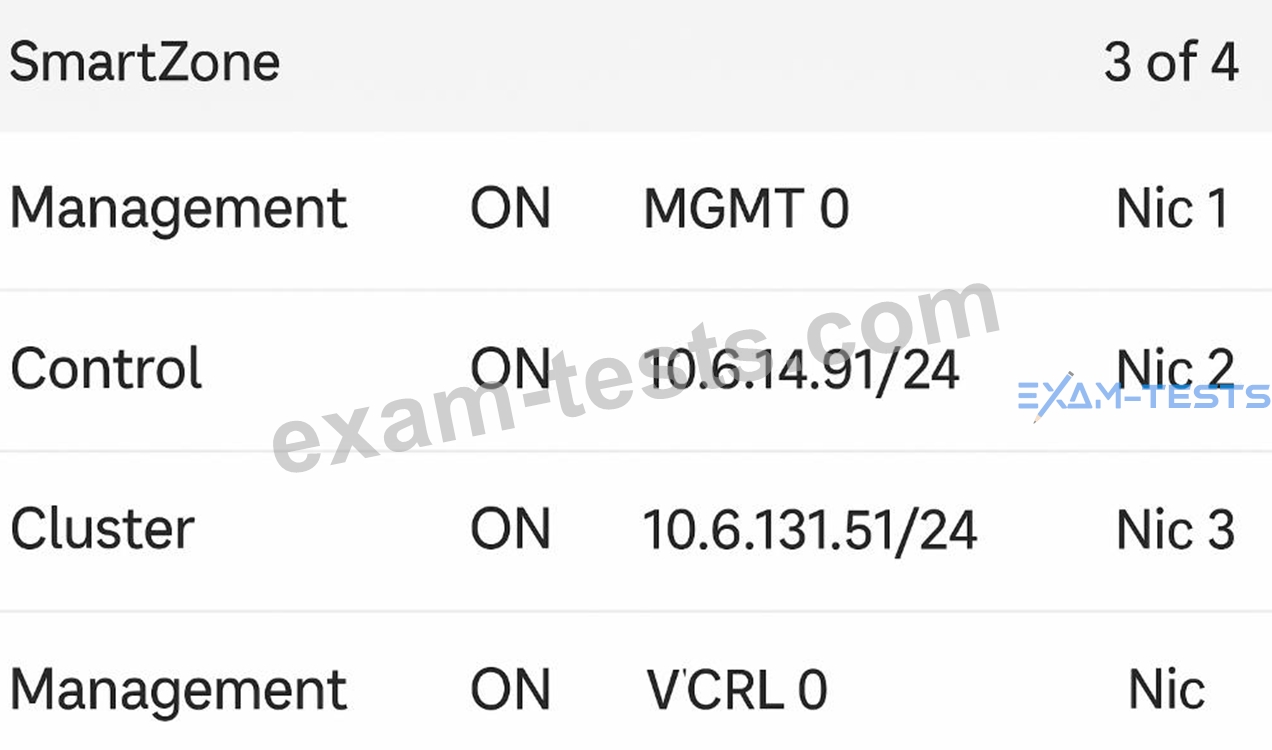 The exhibit shows a virtual SmartZone (vSZ) configuration running in a VMware environment with three separate virtual NICs (vNICs), each mapped to a different port group: Management, Control, and Cluster. According to RUCKUS One Online Help - SmartZone Interface Configuration and RUCKUS AI Documentation - SmartZone High-Scale Architecture, this design is specific to vSZ-H (High-Scale) deployments, which require three distinct network interfaces for distributed control, management, and cluster synchronization. The three NIC mappings confirm physical or virtual separation of traffic for scalability and redundancy (A and E). vSZ-E (Essentials) requires only two interfaces (Management and Control) and does not use a dedicated cluster interface, distinguishing it from vSZ-H (D). There is no indication of a four-node cluster in the exhibit, and SmartZone appliances typically show node counts under the Cluster Dashboard, not at the NIC configuration stage. Thus, based on the configuration, this is a vSZ-H system with three NICs and three port groups, each serving a dedicated function. Reference: RUCKUS One Online Help - SmartZone vSZ-H Network Interface Roles RUCKUS Analytics 3.5 User Guide - Controller Connectivity and Cluster Interfaces RUCKUS AI Documentation - vSZ-H Deployment Topologies and Port Group Mapping